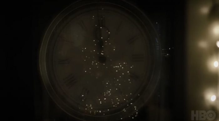 The camera follows the legs of a man in a black suit down the street. He stops next to a Dr. Manhattan mask that is littering the ground and then he reaches down and picks it up with one bare blue hand. HBO. October.