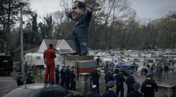 We get a glimpse of a trailer park with a Nixon statue in front of it. The Owlship goes topsy-turvy and crash-lands on the farm in a ball of flames and we see Veidt pushing down a detonator plunger, causing a building to explode.