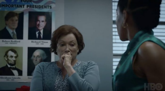 Brief flashes of Abraham fighting in costume are intercut with a classroom scene, where a plainclothes Abraham wows kids by making a smiley face of egg yolks, complete with a spot of blood in the eye—once again harkening back to the iconic Watchmen smiley face. The teacher doesn't approve, but what's more interesting than her reaction is the poster of "Four Important Presidents" behind her.