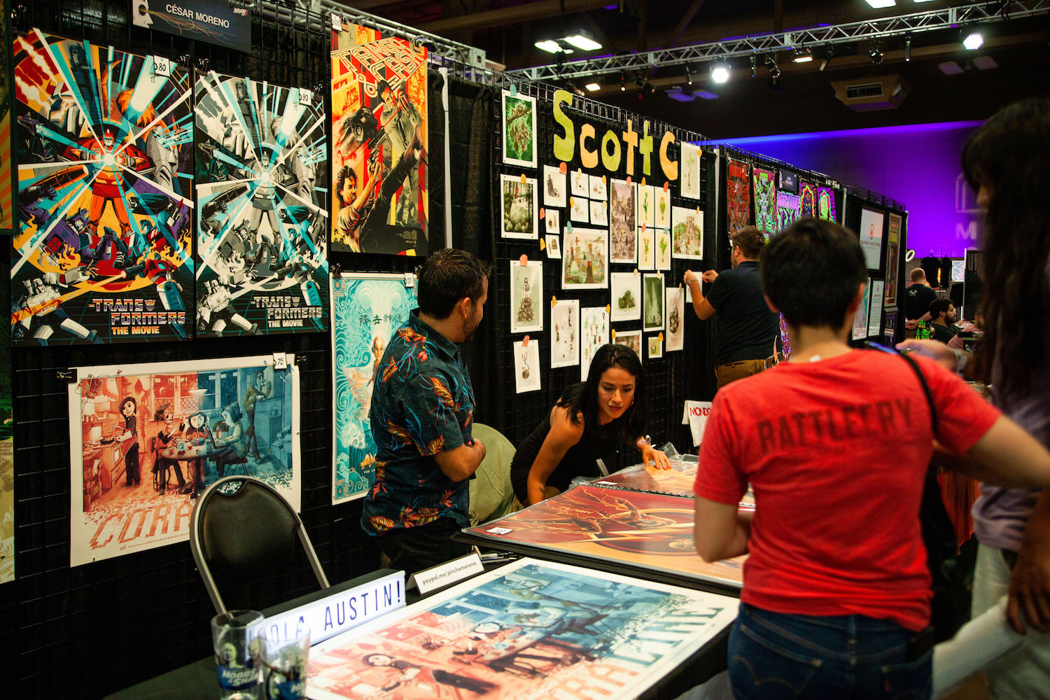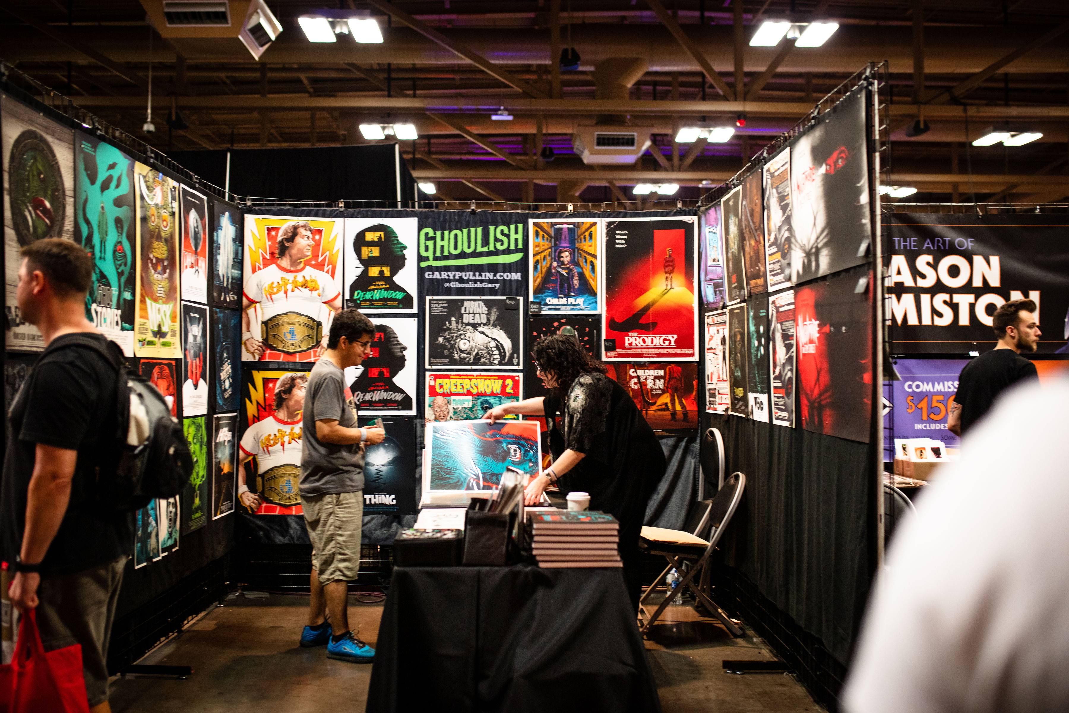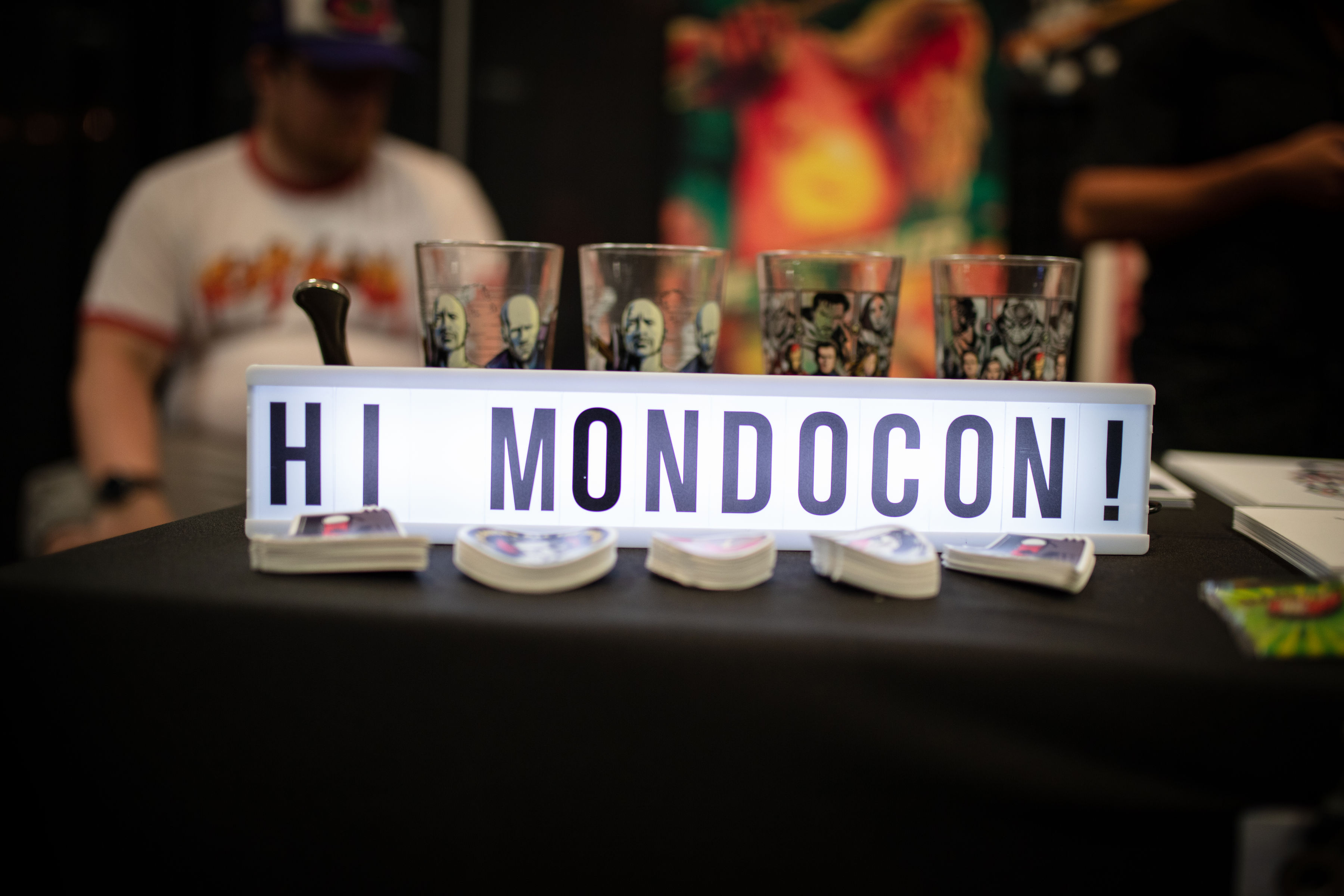The last MondoCon was in 2017 and held at The Austin Statesman. While this space was effective given its large size, it was somewhat segmented with different halls. This year, MondoCon was held at The Palmer Events center — an event space that also holds such annual events such as the Oddities and Curiosities Expo and Austin's annual Record Convention. It's a huge, wide-open space allowing guests to openly wander and easily access all vendors, panels, and amenities. Parking was also ample due to the adjacent garage. Artist booths were set up in rows while sections were brightly projected onto the walls to convey where the vinyl, artists, Mondo booth, and restrooms were located. Right outside the west doors of the building were an array of food and drink vendors such as Southside Flying Pizza, The Peached Tortilla, Lucky Lab Coffee, and Austin Beerworks. If none of those spots struck a chord, visitors can walk across the street to either Black's BBQ or El Alma. There's also the lovely and relaxing Butler Park right next to the Palmer where you could lay in the grass, stroll around, or even walk to the trails that backup to Austin's Lady Bird Lake. This year honestly had the best space both internally and externally for MondoCon.