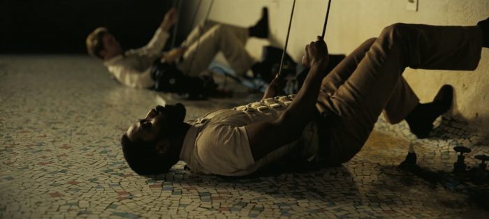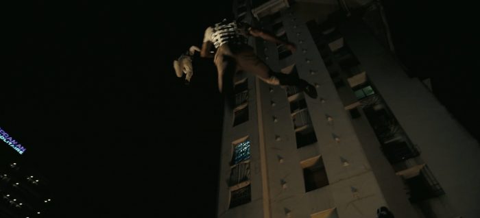Washington and Pattinson fly up toward the building. This doesn't look like they're being pulled up by ropes – it looks like they're literally defying gravity. How is that possible? If you look closely, it becomes clear that Nolan is reversing the shot – running it backward. It's our first hint that time isn't going to function properly here.