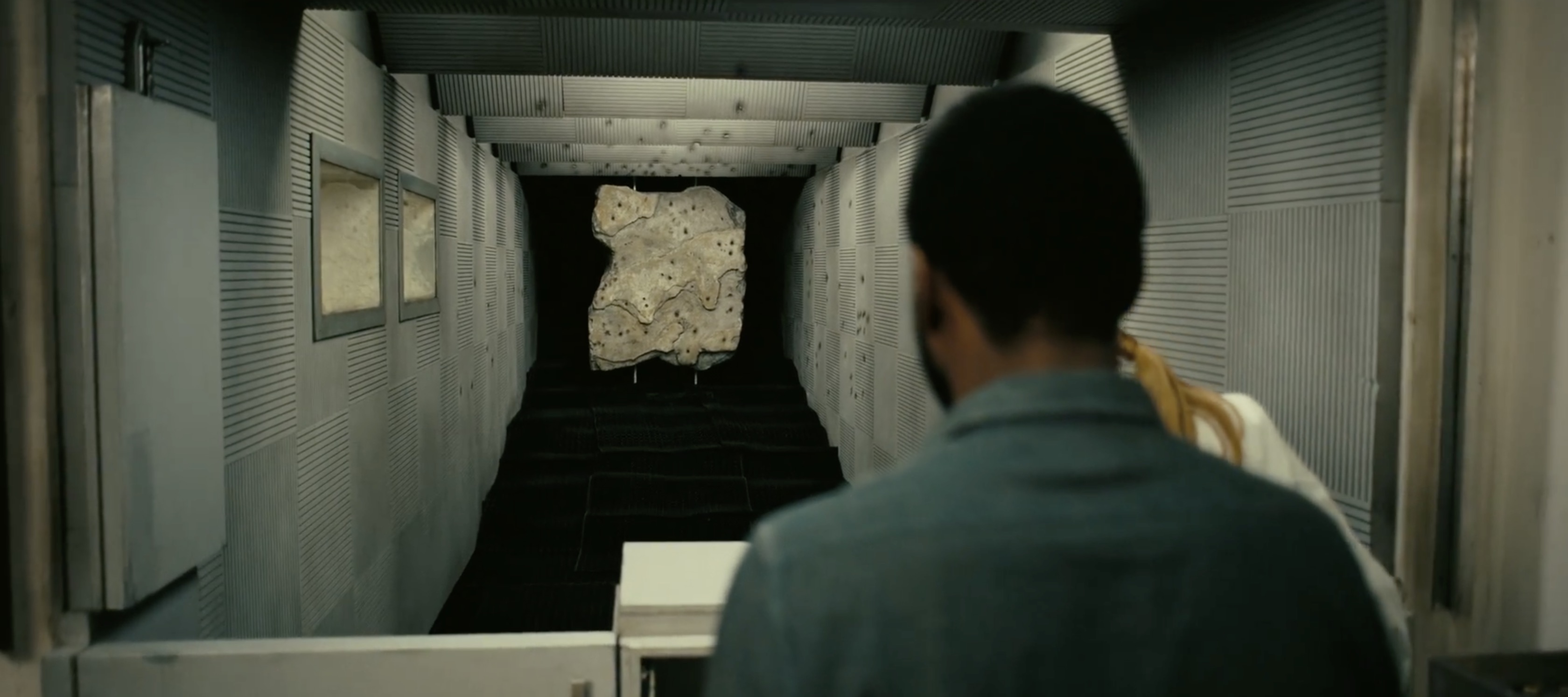 "To do what I do," Washington says, "I need some idea of the threat we face." He comes in contact with Clémence Poésy's character, who tells him: "As I understand it, you're trying to prevent World War III." She then shows him what looks like an art deco shooting gallery featuring a large stone (maybe?) riddled with holes. Again: no idea what the hell is going on here, but it sure is intriguing. "Nuclear holocaust?" Washington later asks. "No," says Poésy. "Something worse."