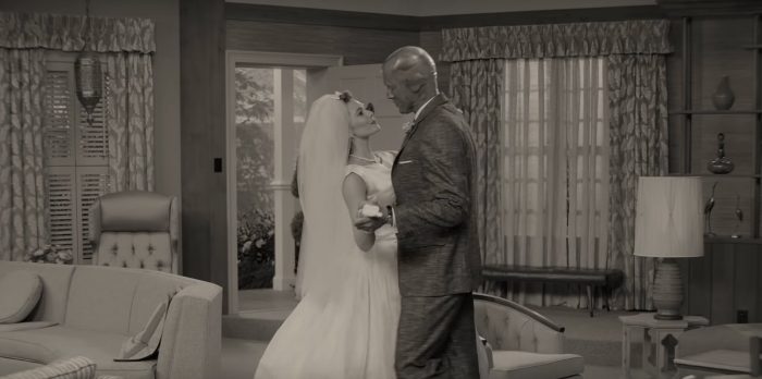 We suddenly go back to the black and white sitcom setting where Wanda and Vision appear to have just been married, coming home for the first time as a couple. If I had to guess, I'd say each episode will unfold in a different decade, and something weird will happen that takes them into the new one, slowly revealing what's afoot in the series.
