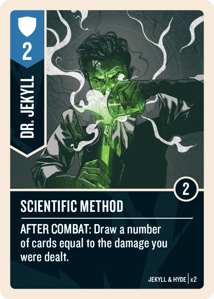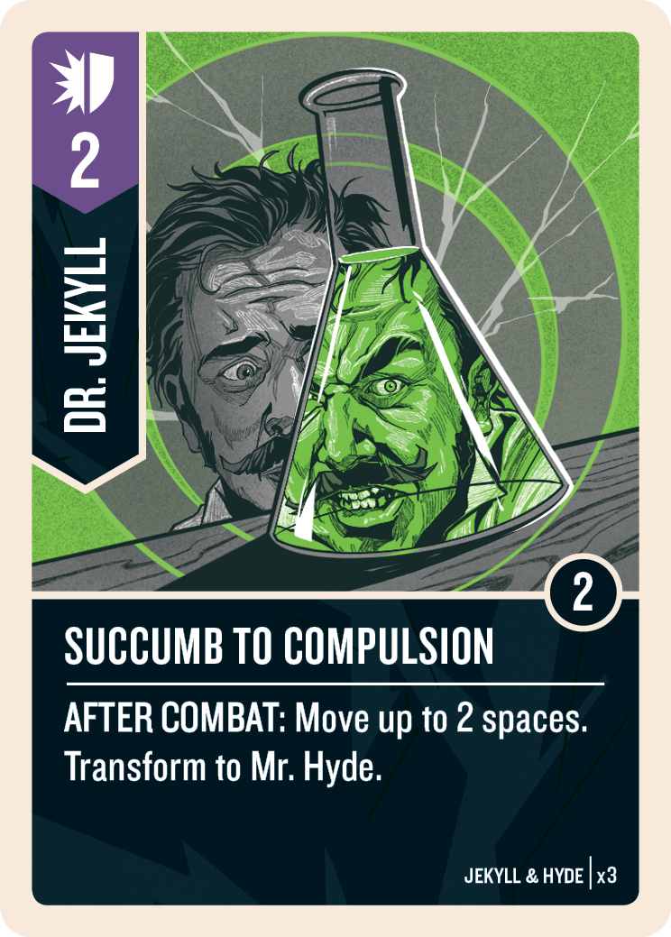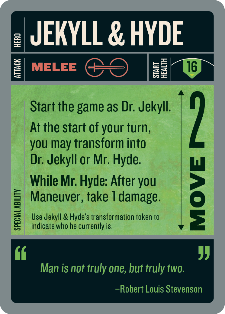 "Hyde cards are all attack cards, but he actually takes damage when he maneuvers. And Jekyll is a scientist. He doesn't have as many attack cards, but he can maneuver and draw the cards and get prepared. And then you flip into Hyde and you might take some damage closing in on your opponent, but then you wail on 'em and then run away and become Jekyll."