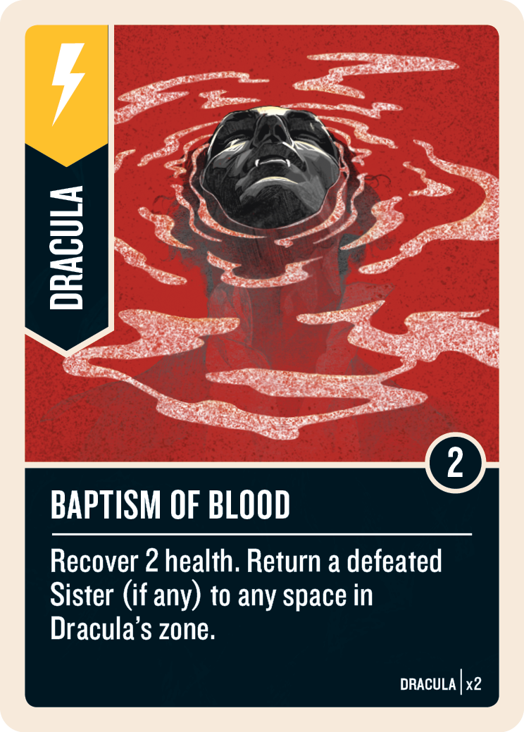 The artwork for the Dracula cards gave Taylor and Thompson a chance to really indulge in the horror aspect of the character. "I think one of my favorite things is going over the top where we can," Taylor says. "One of my favorite things is when you look at the cards for Dracula, there's a lot of blood in there, man."