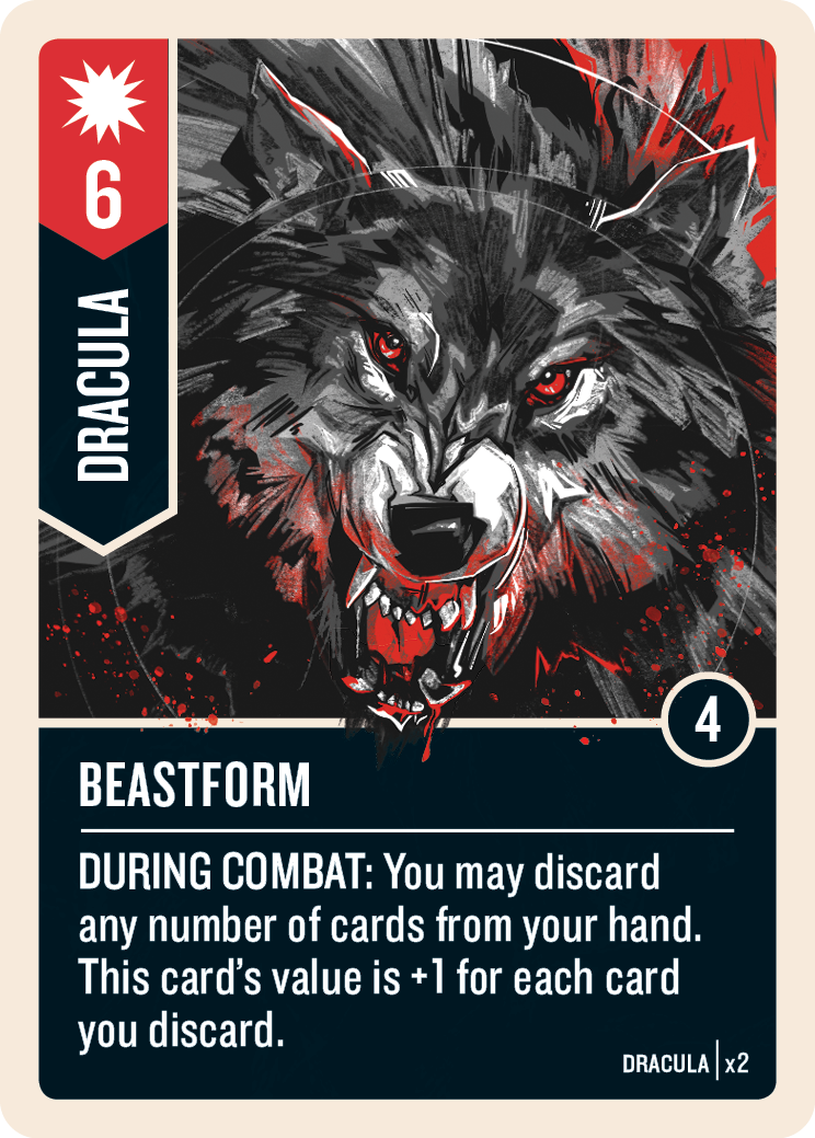 Since Dracula is fragile compared to other fighters (which makes sense, considering the weaknesses and limitations that come with being a vampire), he requires crafty play. This means using his sidekicks to manipulate the board and other players, as seen in the cards above. And since Dracula can grow more powerful by draining the life force of others, he can maintain his life even as he whittles away at others. That opens the door for some of the game's most powerful attacks, like that "Beasthood" card, which can devastate an opponent who scoffed at Dracula's low starting HP.