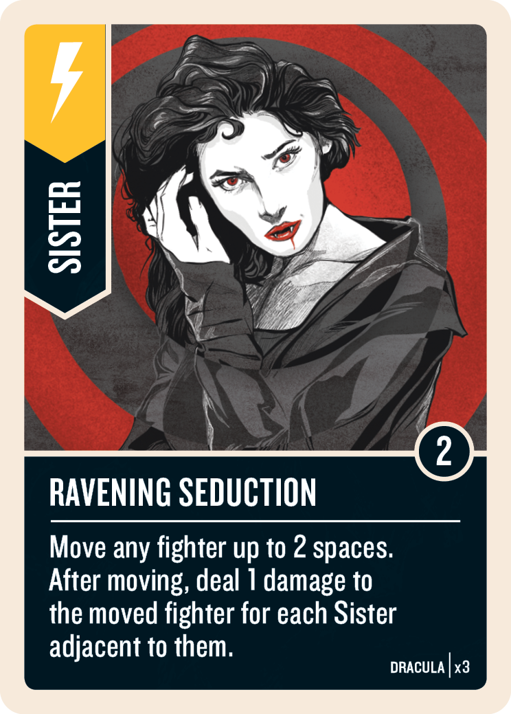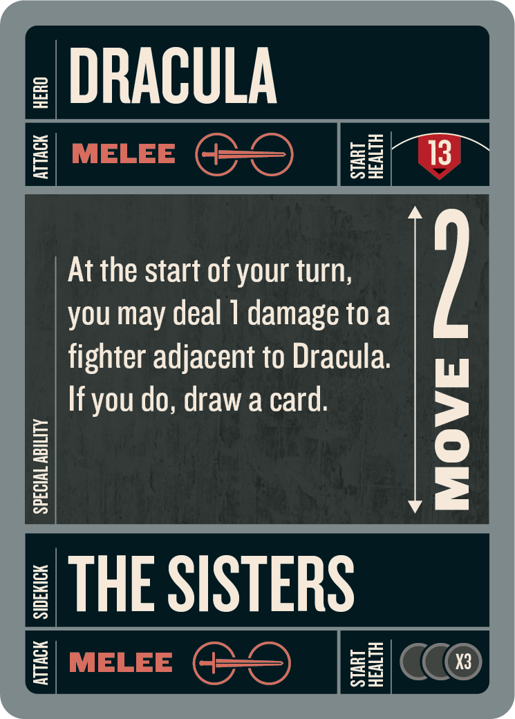 "Dracula is relatively weak. He doesn't have high health or a lot of defense, but you regularly gain health from other people. He can ping his own sidekicks [the vampire trio known as the Sisters] to steal health, but if he starts his turn adjacent to you, he takes one of your health and then draws a card. But he's got a couple killer things in there. The beast form card is brutal. So he has to be played well. He is that refined gentlemen. He's pinging and dancing and disappearing and using his sisters and recovering health, and then suddenly he snaps and turns into a wolf. And if you're not ready for it, that's kind of the end of you."
