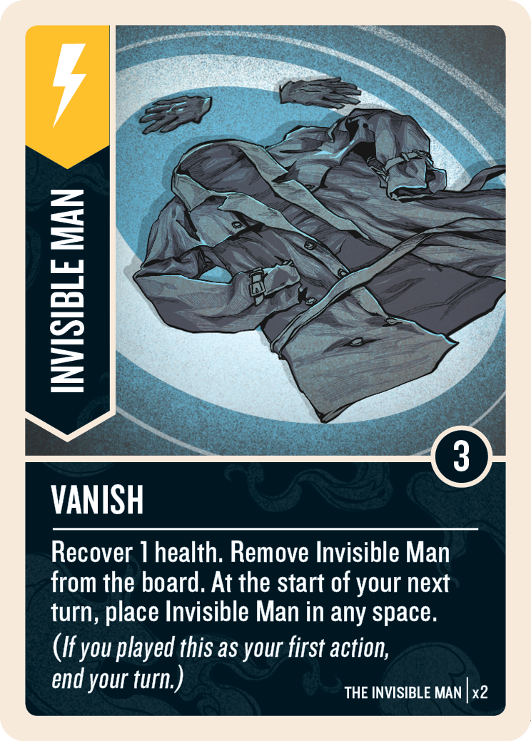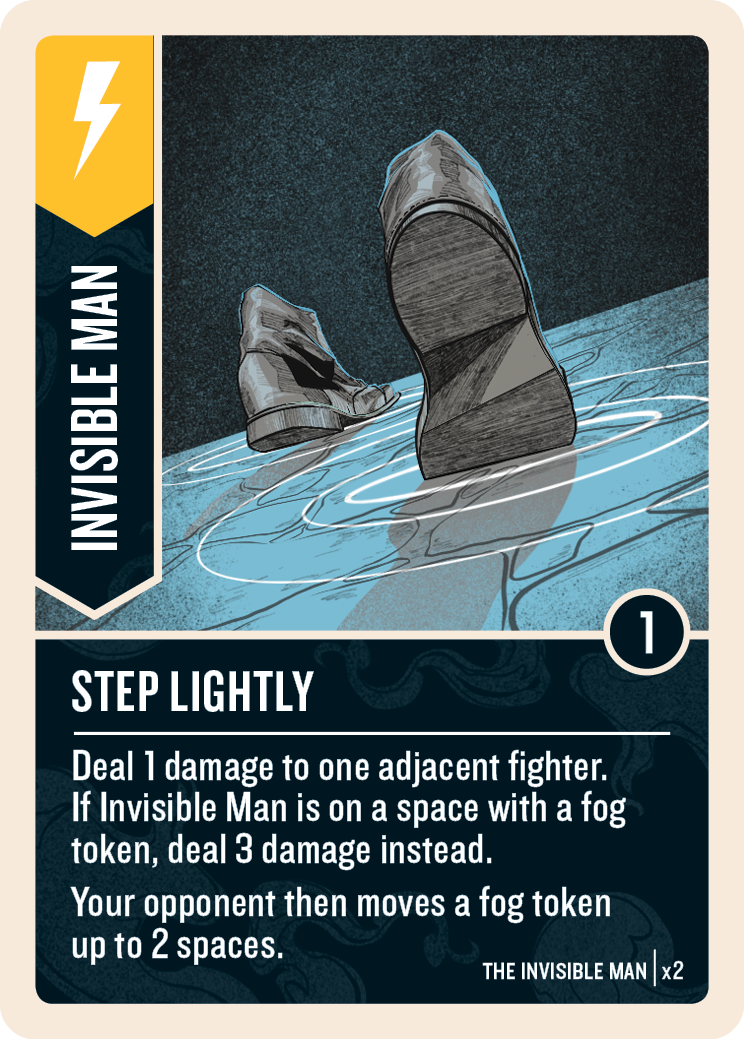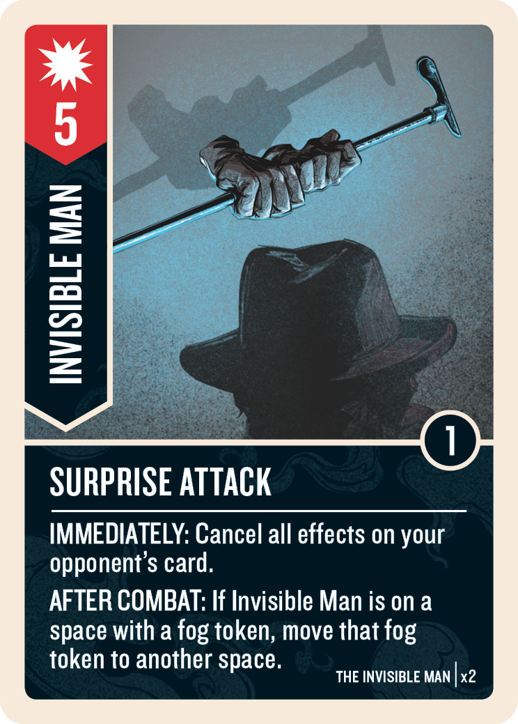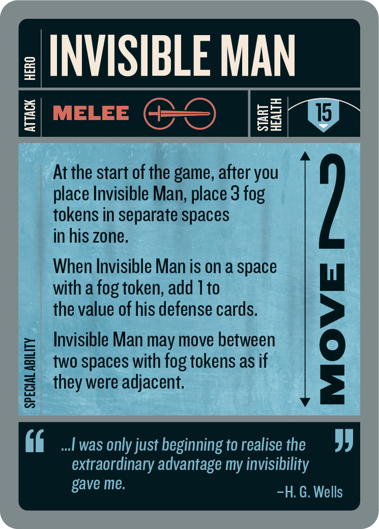 As you'd expect, the Invisible Man relies on getting around unnoticed and unleashing devastating surprise attacks to take down his opponents. "The Invisible Man uses fog tokens," Daviau explains. "These tokens move around the board. The Invisible Man has cards that are improved by being in fog. More importantly, the Invisible Man treats all fog tokens as adjacent when moving, so he can appear almost anywhere."