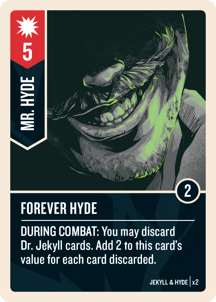 "Jekyll and Hyde are their own sidekicks," Daviau says. "You basically get a token with a potion or elixir of whether it's Dr. Jekyll or Mr. Hyde. And then there are some cards that are Jekyll cards and some cards that are Hyde, so you have to choose which one you're doing."