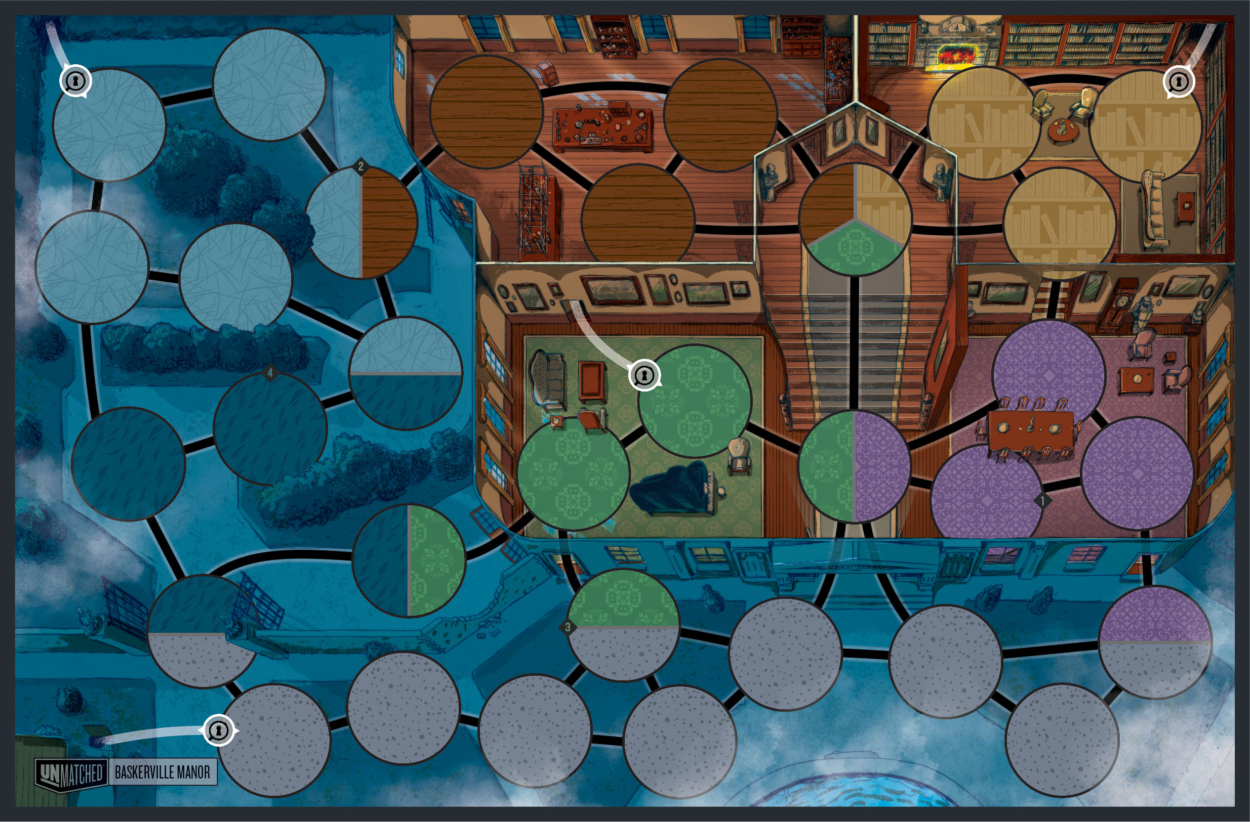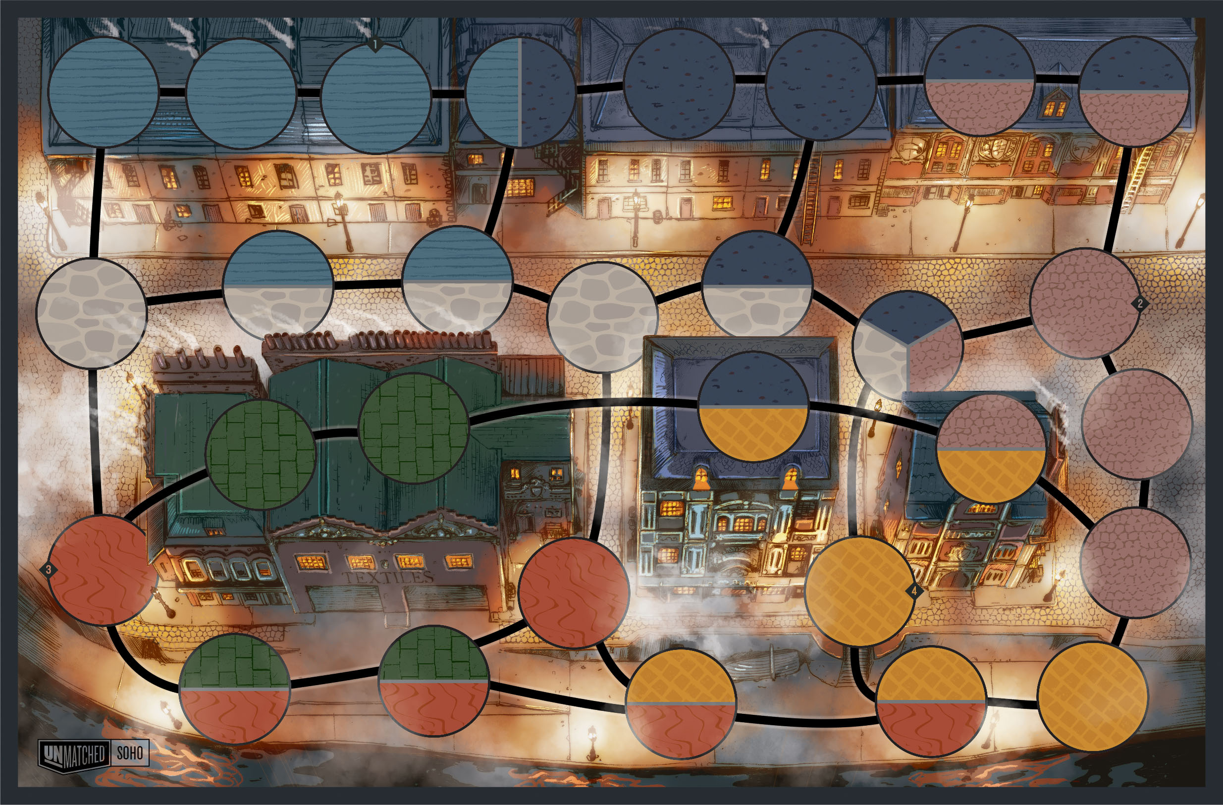 As with the previous sets, Cobble and Fog comes with a double-sided board offering players two new battlefields on which they can test their mettle. The Soho map lets players duke it out on the cobblestone streets, through the narrow alleys, and over the rooftops of London's West End. The Baskerville Manor lets players explore the spooky home to one of Sherlock Holmes' most famous cases, taking them through the foggy moors and offering secret passageways that allow for quick navigation of the map.
