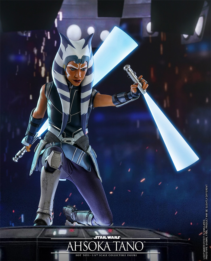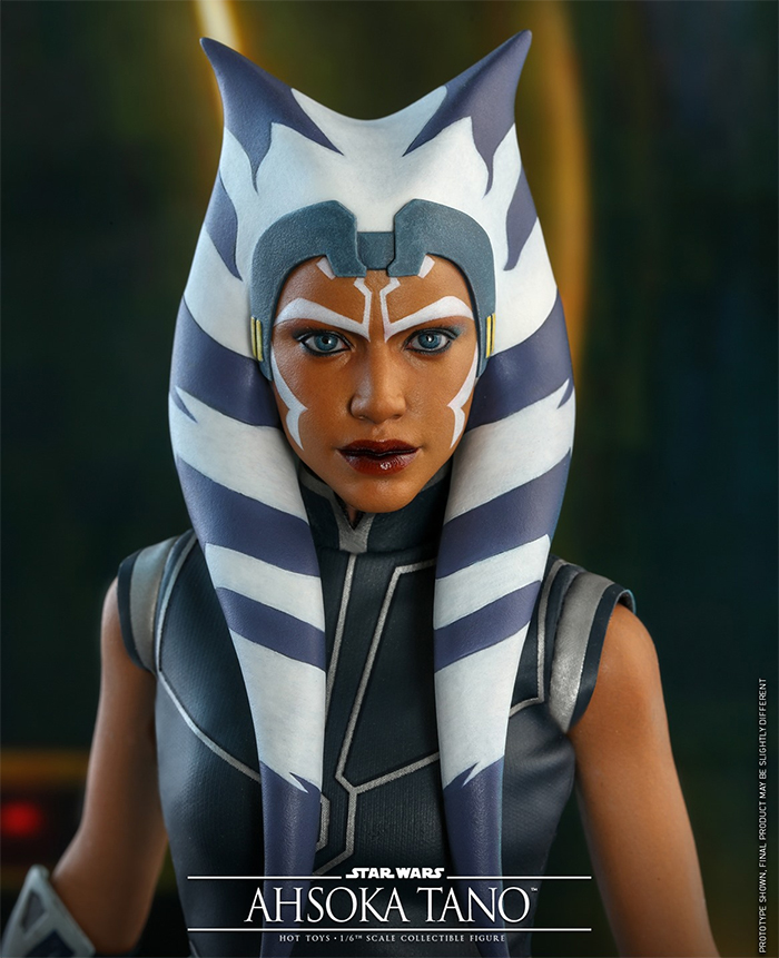 The greatly detailed collectible figure is specially crafted with authentic styling featuring a skillfully crafted head sculpt with stunning likeness and articulated head-tails, specialized body to portray Ahsoka's physique, finely tailored outfit and armor pieces, Ahsoka's iconic lightsabers, a cloak, and a display base!