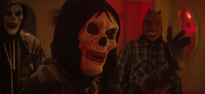 Vicious is right. For the Sake of Vicious, Gabriel Carrer and Reese Eveneshen's ultraviolet Halloween action-thriller, isn't fucking around. For 81 minutes, this thing doesn't let up, throwing one violent set piece after another in our face.It's Halloween, and nurse Romina (Lora Burke) comes home to her trailer to discover her landlord Alan (Colin Paradine) been taken hostage by Chris (Nick Smyth). Chris swears that Alan, who is bloody and duct-taped to a chair, raped his daughter. Alan swears that didn't happen, but it's already been established he's not the most trustworthy guy. Who are we to believe?Before we can even begin to ponder what's really going on here, hordes of masked assailants start descending on the trailer, leading to a series of brutal, tightly-filmed, strongly-staged scenes where characters are violently hurled around the compact space with full force. For the Sake of Vicious suffers from a real lack of narrative – once you strip away all the non-stop violence what remains is rather threadbare. But the relentless brutality, which never feels stagey or false, manages to make this worth your while. You might come away wanting something more, but you won't come away disappointed. – 7 out of 10 – Chris Evangelista