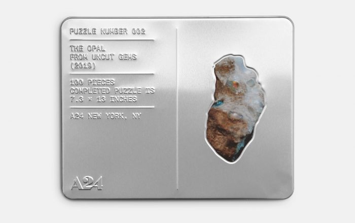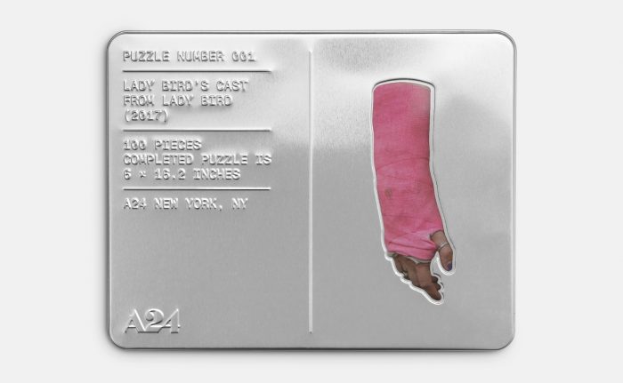 Three choice pieces from the A24 library—some assembly required.Puzzle printed in full color on 2mm board. Pieces come in a tyvek drawstring bag with A24 woven label. 9" x 7" x 1.5" embossed and debossed metal tin with image inlay.