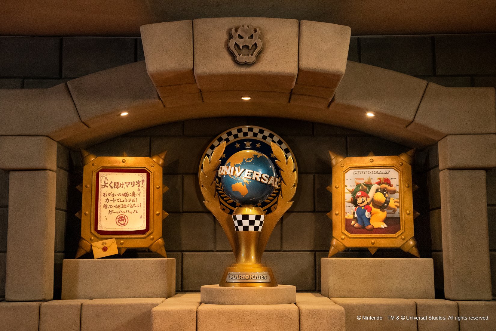 The Mario Kart attraction, according to Bloomberg reporter Kurumi Mori, is called "Koopa's Challenge" and is located inside Bowser's castle (Koopa is Bowser's name in Japan, which suggests the ride may have a different name when it opens in Florida and California). The castle is described as being decorated with "themed walls, doors, banners, ceilings, lights, and a giant statue of Bowser. Visitors see all this and a trophy room while lining up for the ride," Mori writes. We can see that giant statue in one of the above photos released by Universal Studios Japan, at the top of an intimidating set of red-carpeted stairs, as well as the aforementioned trophy room. The released photos also show a concept image of the completed theme park expansion.