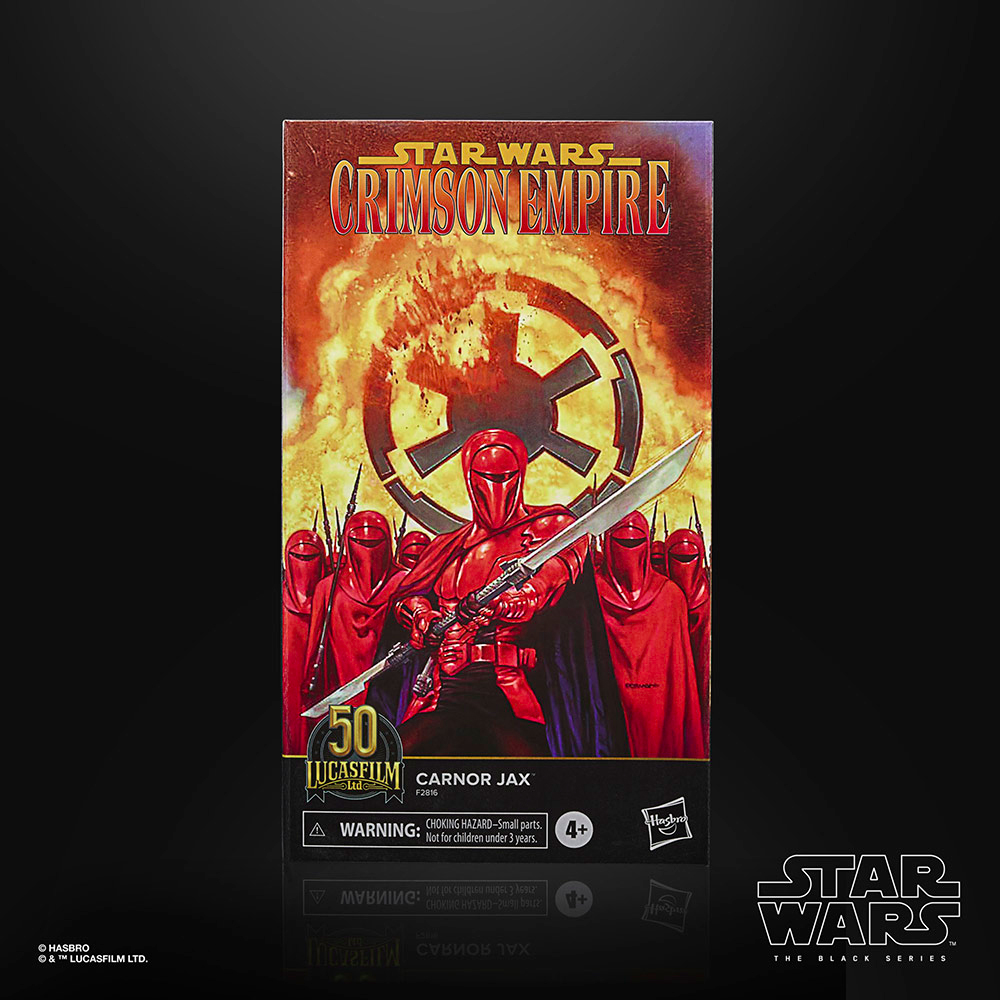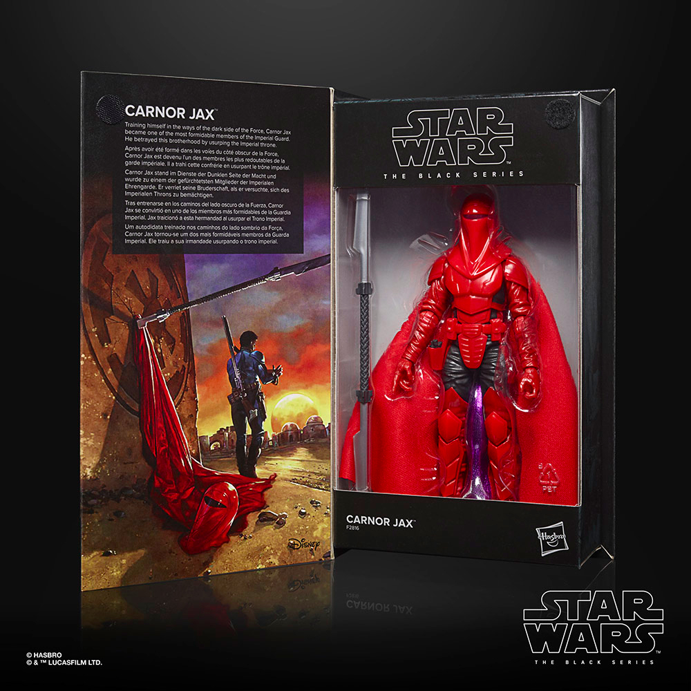 First introduced in the Star Wars: Crimson Empire comic series in 1997, Carnor Jax is a student of the dark side and a rising Sith Lord with a look inspired by the Emperor's royal guards from Return of the Jedi. In fact, the figure itself is merely an updated version of the royal guard action figures that Hasbro already released. Franer explained: