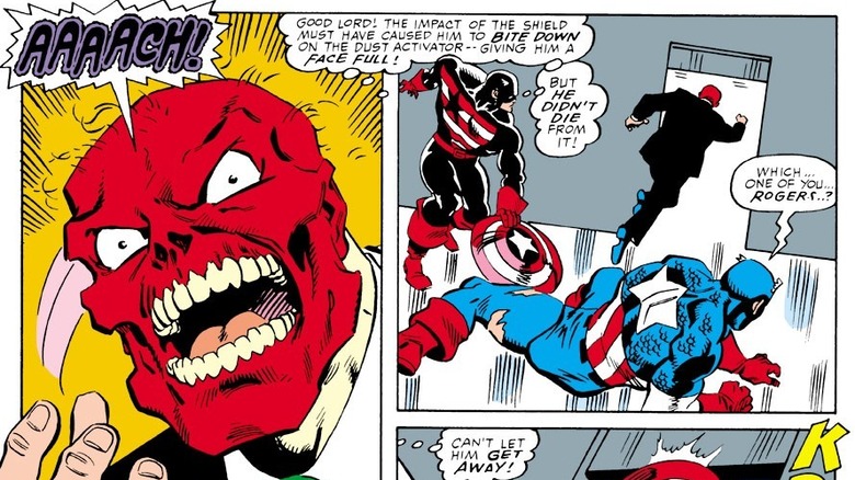 As the Skull gloated over the anonymity that having Steve's face would provide him (this was back when secret identities were still a thing), John struck the Skull with his shield, causing the Skull to inhale a dose of his own Dust of Death. Just as the Joker's Joker Venom twists people's faces into rictus grins, the Red Skull's Dust of Death turned his head into a literal red skull.