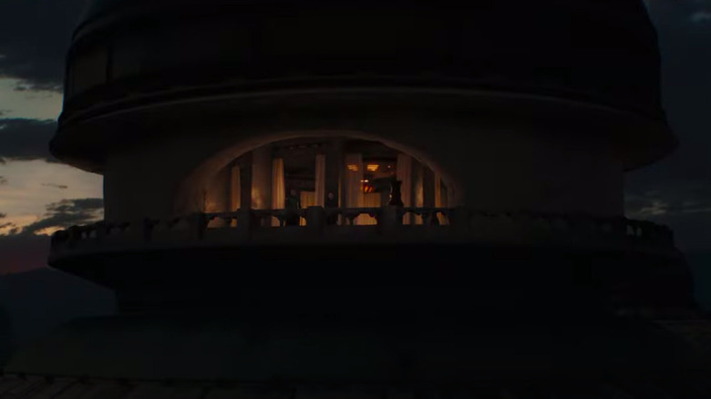 Since Jabba's palace is now Boba Fett's operation, we're bound to see even more of the lair than we've seen before. That includes this balcony, where Boba Fett and Fennec Shand look out over the dark desert. Is there any romance between these two, or is it purely professional? It could go either way. But if that's Boba Fett's bedroom on top of the palace, then they're clearly very comfortable with each other either way.