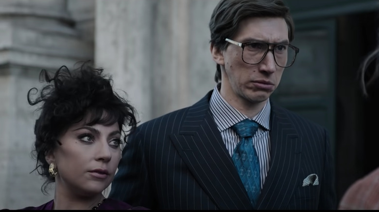 Critics and audiences alike have been gushing over the teaser photos for Ridley Scott's biographical crime drama "House of Gucci" for a while now. Based on the 2001 book "The House of Gucci: A Sensational Story of Murder, Madness, Glamour, and Greed" by Sara Gay Forden, the film's stars are as ornate and glamorous as the costumes they wear. Lady Gaga, Jared Leto, Adam Driver, Al Pacino, Salma Hayek, and Jeremy Irons collectively depict the events leading up to the 1995 murder of Maurizio Gucci (Adam Driver) by his ex-wife, Patrizia Reggiani (played by Lady Gaga), and the subsequent aftermath.