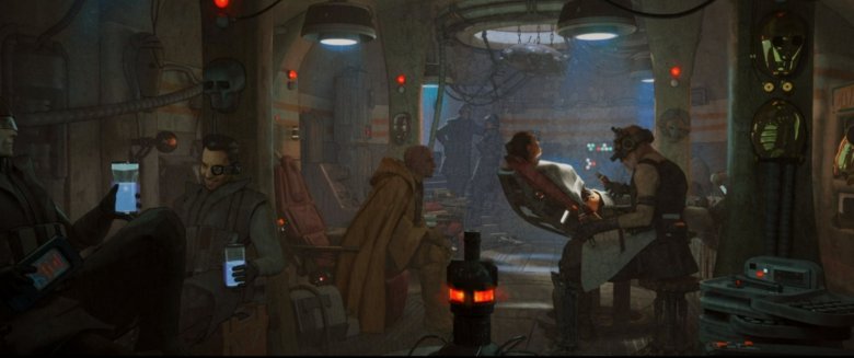 Starting to see why all that hubbub last week over the biker gang of mods was rather silly? Though we don't come back to the exact same gang in this episode, their influence extends to saving the life of Fennec Shand. And a familiar face even cameos as the mod character who puts Fennec's body back together! That's right, the cyberpunk "doctor" who saves her life is none other than Stephen "Thundercat" Bruner, the bassist, singer, and songwriter made famous for his appearances in the band "Suicidal Tendencies." Didn't expect that piece of trivia in your "Star Wars" show, did you? The character in this concept art doesn't bear his likeness, but it's a fun little surprise nonetheless. That's not the only difference, however, as the art also shows some creepy wall decorations in the form of droid heads mounted on the wall like trophies. The "Blade Runner" influences in the scene are already apparent, but clearly the creative team held back just a bit when translating the art into live-action.