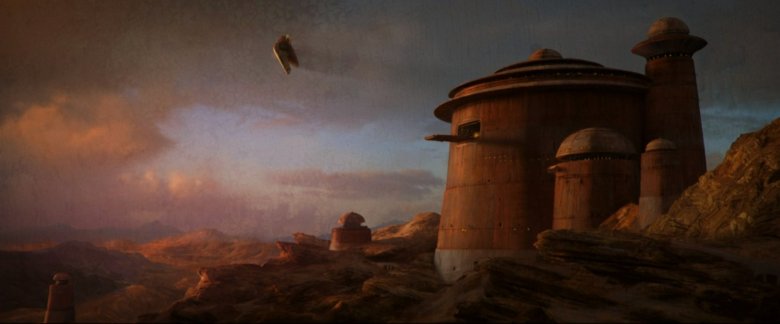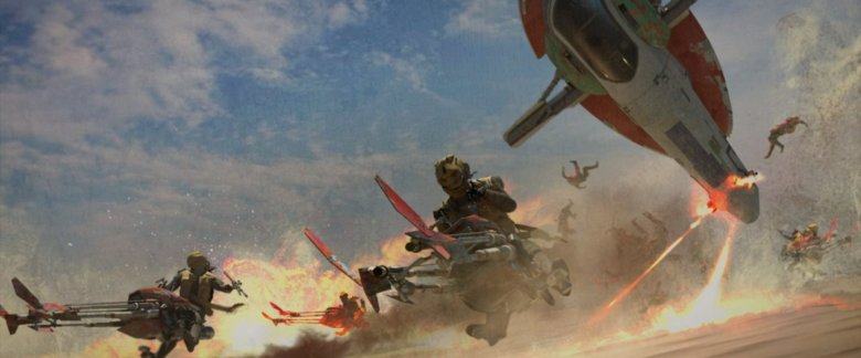 I love concept art that looks painterly enough to hang up on a wall, and this one certainly fits the bill. After successfully infiltrating Jabba the Hutt's Bib Fortuna's palace, Boba and Fennec flee the scene of the crime (although, does it technically count as stealing if it belonged to him in the first place?) and head out on the next step of his revenge tour. Jabba's former palace was first brought to life in the original trilogy as an actual matte painting, so it only feels fitting to see that proud tradition continue here, even if it's just concept art. Seeing George Lucas' and Ralph McQuarrie's legendary vision, brought to life in all their glory, will never get old for me.