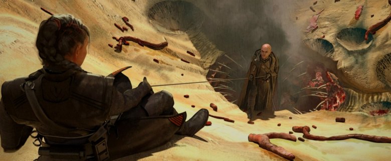 You didn't think "Star Wars" was just going to stop taking inspiration from "Dune," did you? This next sequence features Boba Fett returning to the location of his infamous demise, though he's come prepared with a few more toys of his own this time around. This artwork recalls a very similar shot composition from Denis Villeneuve's "Dune," with the fearsome sand worms of Arrakis standing in for the menacing Sarlacc of Tatooine. Of course, it's only natural that Boba would feel compelled to settle a score with the monster that took everything from him back in "Return of the Jedi." The trouble is, Boba mistakenly assumes his armor is still inside the creature's abode and he risks his newly recovered ship to get it back.