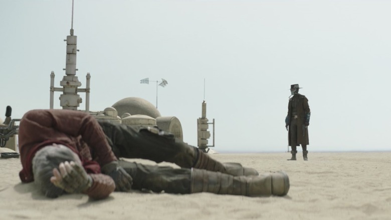 For fans of "The Clone Wars, it was very likely clear who he was from the moment we saw him in the distance, but the character who showed up to have words with Cobb Vanth was none other than Cad Bane, the famed blue-skinned deadly bounty hunter. This serves as the character's live-action debut and director Dave Filoni didn't waste the opportunity to introduce those who didn't watch the animated "Star Wars" stuff to his brand of ruthlessness. When he finally approaches the town after Cobb clears the streets (sensing things might get ugly), Cad reveals his face and also reveals that he is clearly working with the Pykes. He encourages Cobb and his people to stay out of it, to let the spice flow, and nobody will be hurt.