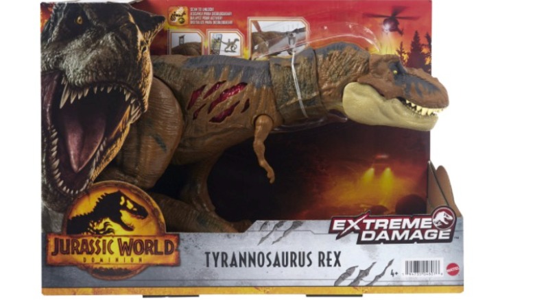 Get ready for thrilling action and adventure with Jurassic World Dominion! This Extreme Damage Tyrannosaurus Rex figure is inspired by a dinosaur from the franchise and features extreme slash damage on BOTH SIDES — just press the button on the top to reveal the double-sided damage! Watch out — this dinosaur figure may have been damaged in battle, but she can still fight back, with a button-activated CHOMP! The T. rex figure also has movable joints, authentic sculpting and realistic color and texture. Bring the 19 inch long T. rex TO LIFE with extended digital play using Augmented Reality! Dare to see how REAL dinosaur play can get! Just scan the hidden DNA code with any smart device to unlock the AR experiences in the free Jurassic World Facts app. Smart device not included. Makes a great gift for fans of Jurassic World and dinosaur action play ages 4 years old and up. Colors and decorations may vary.