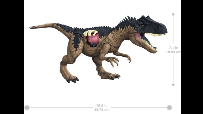 Get ready for thrilling action and adventure with Jurassic World Dominion! This Jurassic World Extreme Damage Roarin' Allosaurus is inspired by the movie. Fierce and ready for conflict, this carnivorous dinosaur makes a CHOMP motion with ROAR sounds when the button on its back is pushed. This large dinosaur figure stands about 7 inches tall and 19 inches long. Intense dinosaur battles can result in major damage, and on this Roarin' Allosaurus, the battle scars are multi-level extreme. Push aside the skin to see the gaping hole and exposed ribcage. Crack open the ribcage to see and feel the rubbery pink organs inside. SO COOL! This toy will be a must-have for dinosaur lovers ages 4 years and older. Bring this dinosaur TO LIFE with extended digital play using Augmented Reality! Dare to see how REAL dinosaur play can get! Just scan the hidden DNA code with any smart device to unlock the AR experiences in the free Jurassic World Facts app. Smart device not included. Colors and decorations may vary.