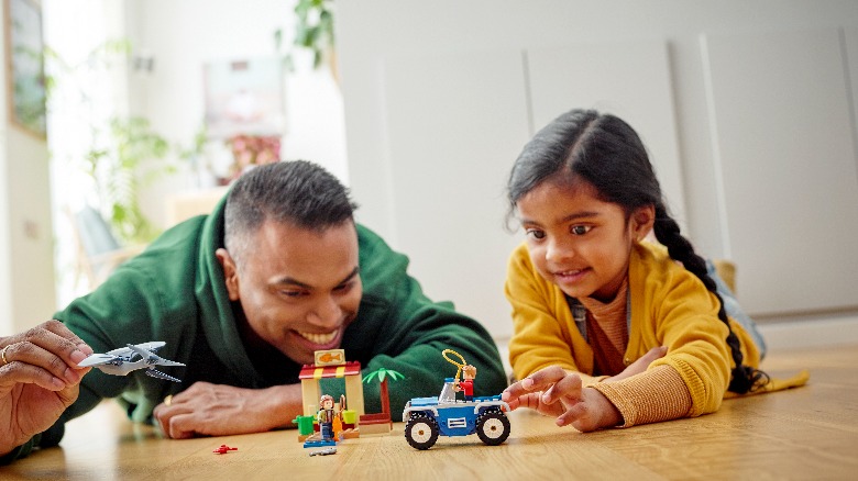 The set has an airport you can build, a helipad, a helicopter, and a fence that absolutely won't hold back a very large and very hungry T. rex (There is no way you could do a Jurassic Park story without this dude). There are minifigs of Owen Grady, Zia Rodriguez, and that redshirt wildlife guard tasty snack as well. You even get a dinosaur egg, a walkie-talkie, and a tranquilizer gun "to play out your own story." Huh. You don't read the words "tranquilizer" and "play" in the same sentence very often outside of a horror film. And oh yeah, Owen seems to be holding a chicken leg. For some reason. And this won't be the last time we see it, either.