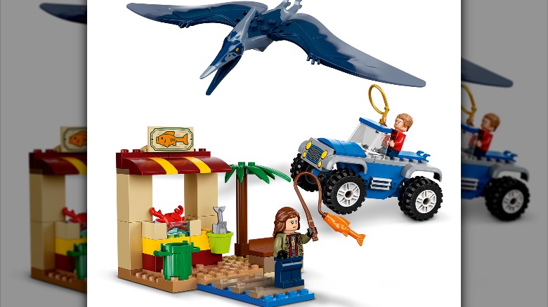 The word "dominion" is in the title of the film, and it definitely isn't human dominion. Dinosaurs rule the Earth once again, and we humans look like walking cheeseburgers. This set is the LEGO Jurassic World Pteranodon Chase, set number 76943, which retails for $19.99 EUR/USD. There are 91 pieces and it's for ages four and up. It's over 3.5 inches high, 4.5 inches wide, and 5 inches deep.