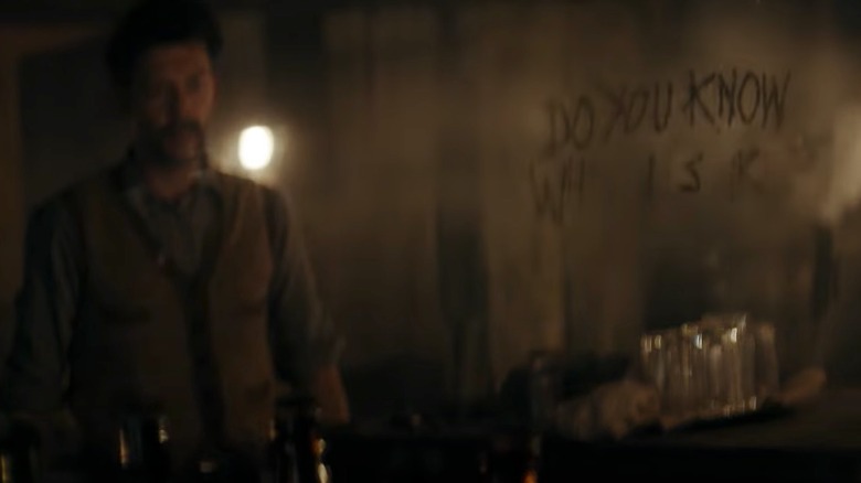 We then see Aberforth Dumbledore looking at a mirror that has ghostly writing appearing as though someone is writing with a finger on condensation.