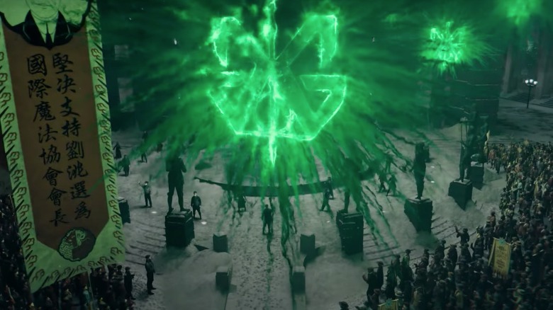 Dumbledore walks through that town with the tower and catches a golden snitch. What that's doing there is a mystery, but he doesn't look as happy as people usually are to catch one of those things. We see those Grindelwald symbols appear in green light and smoke at what appears to be a rally like the one at the end of the second film. I'm not sure what language that writing is in, but here it is so you can decide for yourself. It could be Dzongkha if this is in Bhutan, which we know is in the film, but there are a lot of languages spoken there and I am no expert.