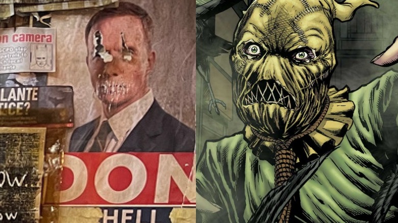 Beyond the aforementioned villain teases, the Riddler's furious evidence-gathering has some additional subtle elements that may prefigure villains who could appear elsewhere in the Batverse. In one photo on the conspiracy board in Riddler's "sanctuary," Mayor Don Mitchell is seen in the upper-right hand corner with his face slashed out — slashes over the eyes and more over his mouth. While this is an extremely subtle reference, the pattern of slashes resemble a common mask of one of Batman's most iconic villains: the Scarecrow.