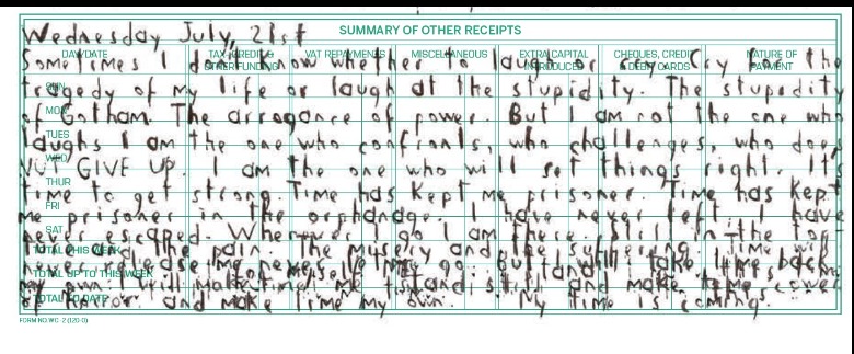 Buried in Riddler's journals is yet another, more interesting tease of the nefarious villain we know as Joker. Following a host of journal entries where Riddler chides Gotham and expresses his desire for revenge on behalf of his pain and orphans everywhere, the last journal entry (July 21st) before the journal becomes increasingly unintelligible repetition also teases the "Clown Prince of Crime."