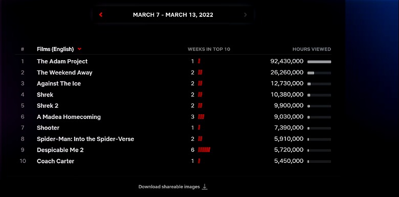 The films that surpass the launch numbers of "The Adam Project" since the introduction of the new metrics are "Red Notice" (another Reynolds-starrer), which clocked 140 million hours, and Adam McKay's star-studded disaster comedy, "Don't Look Up," which clocked 111 million. "Red Notice" also went on to rank number one on the list of most-viewed Netflix movies within a 28-day span since release.
