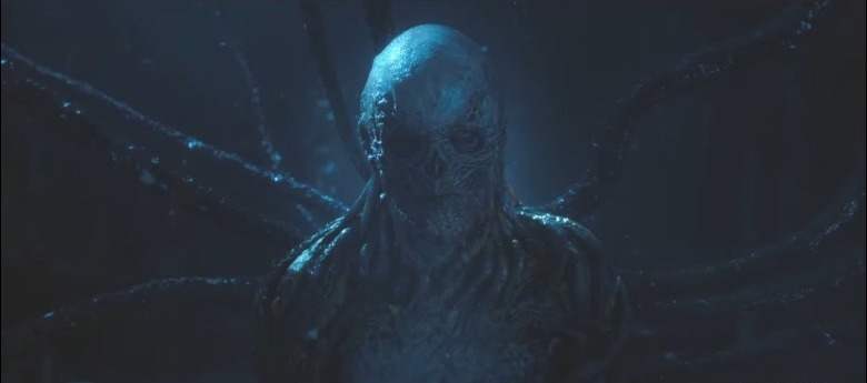 While the Mind Flayer, the Demogorgon, and the Spider Monster were terrifying in their own right, the idea of a hybrid beast/human creature with powers of speech and comprehension is the stuff of nightmares. We get a close-up shot of the monster in the first few minutes of the trailer, in which the creature sports wrinkly spin, a full body with human-like features, clawed hands, tentacles, and blue eyes. Here's the full reveal below.