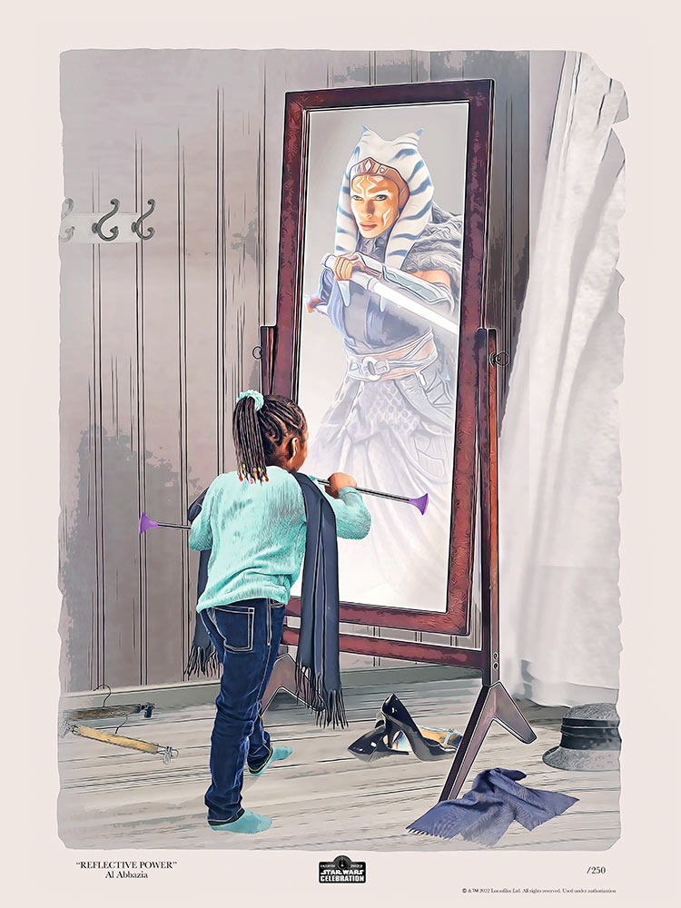 Another eye-catching piece is "Reflective Power" by Al Abbazia. This one depicts a little girl playing in front of a mirror with a reflection of Rosario Dawson's live-action version of Ahsoka Tano from "The Mandalorian" and "The Book of Boba Fett."