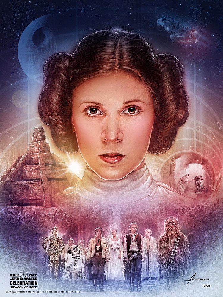 Finally, "Beacon of Hope" by Adam Schickling puts the late Carrie Fisher front and center. As Princess Leia, she's rocking her signature hair buns from the original "Star Wars" movie, and her face looms larger than life over the royal awards ceremony on Yavin (still no medal for Chewbacca).