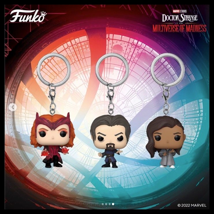 Next up are the Pop! Keychains, which include the Scarlet Witch with red magic in her hands, Sinister Strange looking like things just got out of hand, and America Chavez in her Kamar-Taj training outfit again.