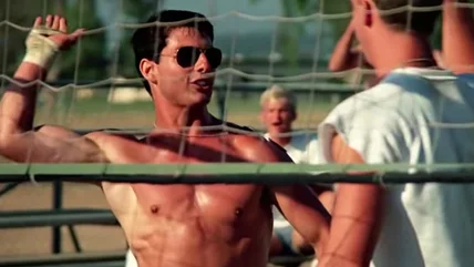 There are so many scenes of sweaty muscled men strutting around one another like prowling peacocks, clad in nothing but towels that seem ready to fall to the floor at a moment's notice. The guys play volleyball in the scorching sun in a scene set to the Loggins song "Playing With the Boys." It's hard not to be taken in by lines like "you can be my wingman anytime" and "I want somebody's butt, I want it now!"