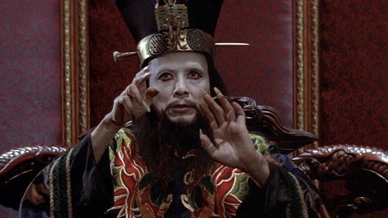 Jack goes to the airport with Wang to pick her up, but before they get the chance, she's kidnapped by a gang of hoodlums called the Lords of Death. Chasing them to Chinatown, Jack and Wang witness a vicious turf battle between two rival factions. The violence is broken up by three supernatural entities known as the Storms, and their boss David Lo-Pan (James Hong), a 2000-year-old sorcerer who needs a girl with green eyes to break an ancient curse. Wouldn't you just know it, Miao Yin has green eyes ...