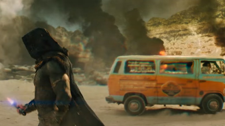 The last sequence in the trailer offers both some of our best looks at Johnson in action, as well as one of the only other moments of humor in the trailer. Upon landing in the desert, a couple of unsuspecting onlookers in a van suspect they are in a bad spot and humorously roll up their windows. Then, Adam catches a rocket in his bare hand in a pretty baller move.