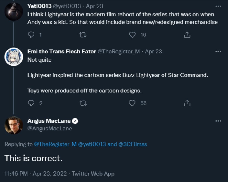 For one thing, "Lightyear" director Angus MacLane has said on Twitter, in Q&A sessions, and in interviews that "Buzz Lightyear of Star Command" exists as an animated TV show within the canon of the "Toy Story" universe, and in that universe, the movie "Lightyear" is what inspires the creation of the cartoon series.