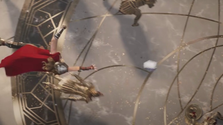 The Norse, Egyptian, and Wakandan gods are not the only ones in the MCU. With "Thor: Love and Thunder," we're being introduced to a whole lot more deities including Zeus (Russell Crowe) and his pantheon. Zeus is a cheeky god, at one point flicking the clothes right off of Thor (Chris Hemsworth). He sits on a flying throne room/dias/platform thing in a stadium full of gods from around the universe, in a floating city packed with celestial forms. (That's lowercase celestials, not the ones we saw in "Eternals.") They're ranked by size, and seem to have no issue with what Gorr the God Butcher (Christian Bale) is doing to their fellows who don't dwell in Omnipotence City.