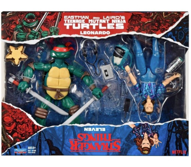 The new action figure sets pair the Turtle Leonardo with Eleven, and Raphael with Hopper. These aren't the Turtle designs you may be thinking of from the newer series "Rise of the Teenage Mutant Ninja Turtles." These guys are the 1984 comic book version. They're available for pre-order at Target, with each set going for $39.99. Each two-pack comes with the figures, as well as matching accessories for each character.