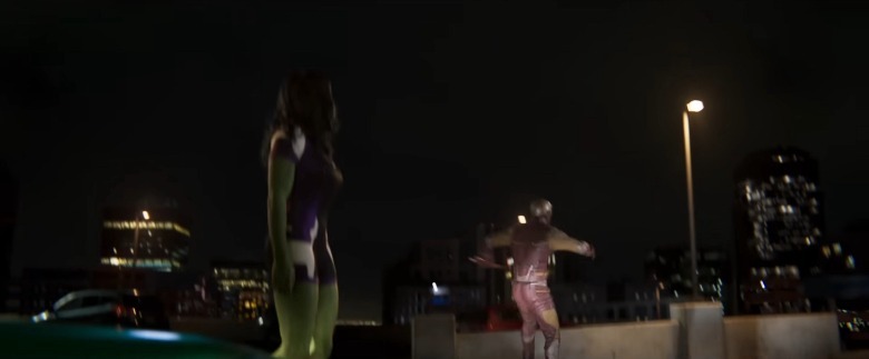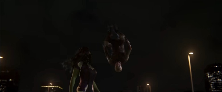The scene goes by in a matter of seconds, but after painstakingly examining the sequence frame by frame, it certainly looks like Daredevil jumping and flipping circles around She-Hulk. Also, if you look closely at his costume closely in the light of the cars' headlights, it looks like this suit is inspired by the blind vigilante's red and yellow costume mixed with his armored suit from the '90s.