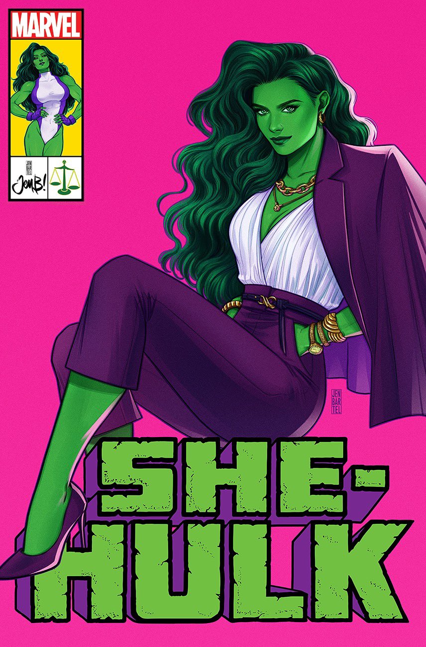 When Titania busts into the courtroom, Jen's associate tells her to do her thing. As she transforms into her big green alter ego, she laments having worn an outfit that she really likes. The loss of one great outfit to benefit the greater good isn't too bad though, right? It's always funny how the Hulks always find a way to work purple into their wardrobe. It's a solid color and really pops against their green skin. This frame from the trailer looks like the sort of outfit superstar artist Jen Bartel might put She-Hulk in for an impeccably colored comic book cover.
