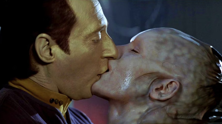 As a franchise, "Star Trek" has had its fair share of significant kisses. Take, for example, the one shared by Data (Brent Spiner) and the Borg Queen (Alice Krige) in "Star Trek: First Contact." Data is held captive by the Borg to gain access codes to the Enterprise via his neural net. As time passes, Data meets the Borg Queen and realizes that she'll do anything to find the android's weaknesses — including grafting human skin onto his arm which allows him to feel a new sensation, pleasure. Yet, that isn't the only trick up the Queen's cybernetic sleeve, as she eventually seduces Data into an intimate smooch.