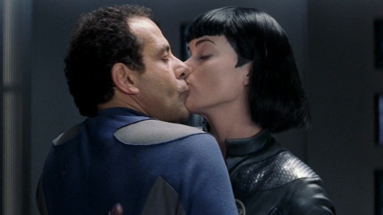 While many of the kisses on this list have a genuine romantic feel, a few serve a more comedic purpose. Take, for instance, the iconic smooch from "Galaxy Quest," when Fred Kwan (Tony Shalhoub) and Thermian crewmember Laliari (Missi Pyle) embrace in quite the quirky fashion. In the scene, Fred, Laliari, and Guy (Sam Rockwell) are watching Fred's successful use of the digital conveyor on a video monitor. To celebrate, Laliari begins to frantically kiss Fred, leading the pair to get more intimate as she reveals her true form.