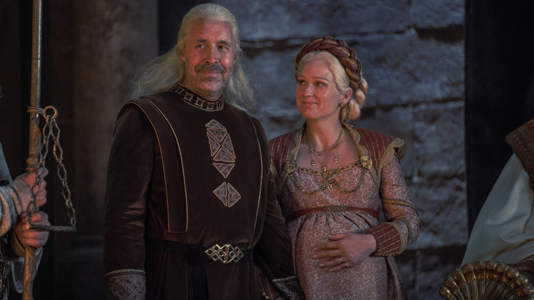 While "Game of Thrones" decided to ignore the Targaryen's prophetic tendencies, "House Of The Dragon" has clearly opted to embrace them. To be fair, it's a lot harder to ignore such a significant ability when there are many more Targaryens milling around. But it also makes for an ominous addition to the story. In the first episode alone, two different dreams are referenced. The first comes from King Viserys himself, who is quite literally distracted by his dreams of having a son. While Aemma ( Sian Brooke) awaits labor after a long and painful pregnancy, she tries to temper her husband's expectations — reminding him that they can't know the gender of the child until after it's born. But Viserys claims that he knows she'll give birth to a son because he saw it in a dream.